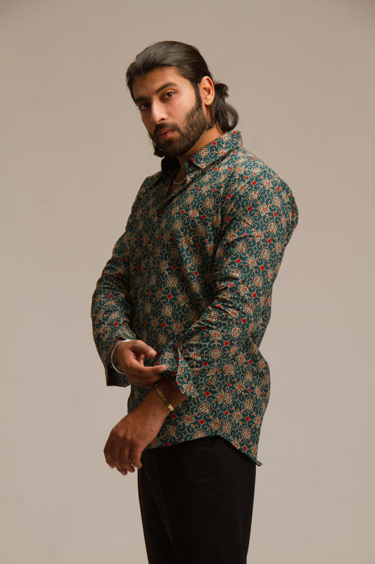 Olive Green Ajrakh | Mens Cotton Printed Shirts